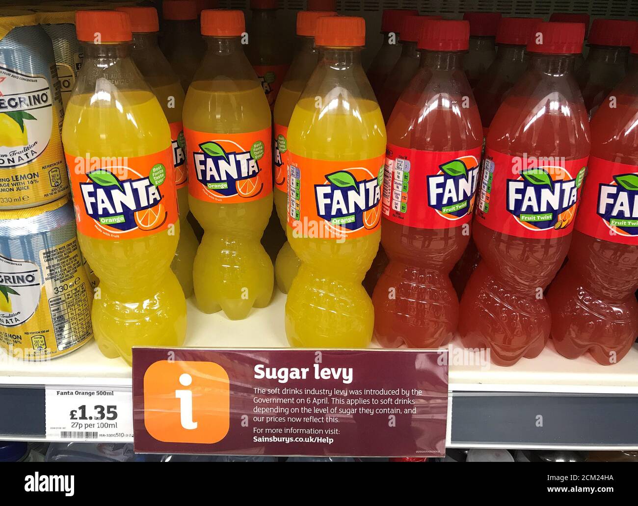 A sign informing shoppers about the UK sugar Levy is seen on a shelf of Fan... By A sign informing shoppers about the UK sugar Levy is seen on a shelf of Fanta so